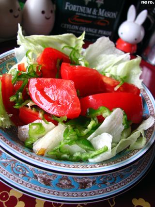 ・さて本日のメニウ・ トマトサラダでございます。 ちぎったレタスに、乱切りトマト、スライサーかけたピーマン。 そこに自作ドレッシング。 酢、オリーブオイル、塩、黒胡椒・・・で撹拌。 いつも通り定番ドレッシングですねぃ。好物トマトサラダ。